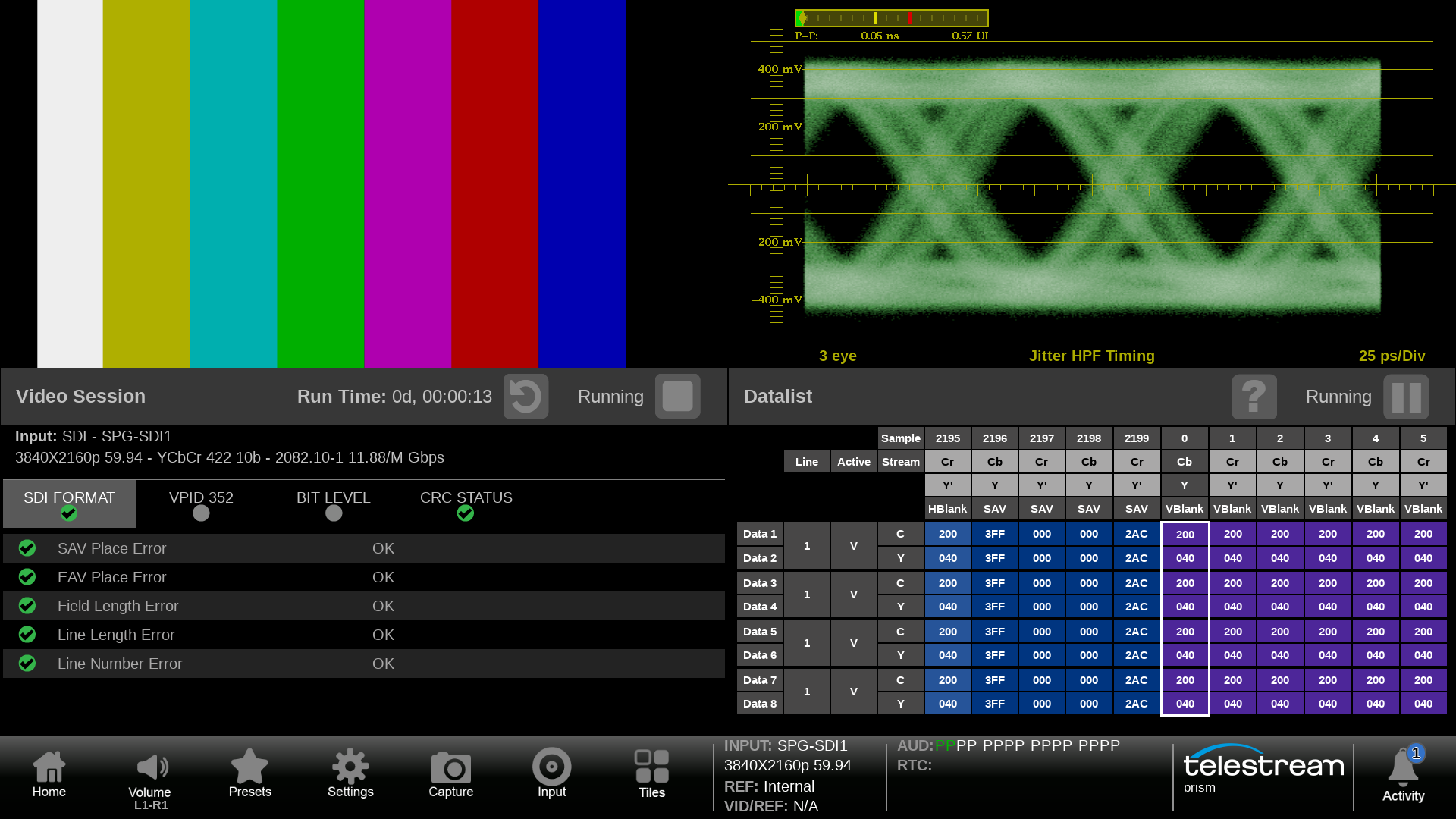 Ensuring continued operation of equipment within the facility or network is critical to maintaining a high quality. The Telestream PRISM provides and extensive set of tools to aid in troubleshooting problems and diagnosing issues. For SDI a 12G Eye display can be used to check on the health of transmission of the signal.