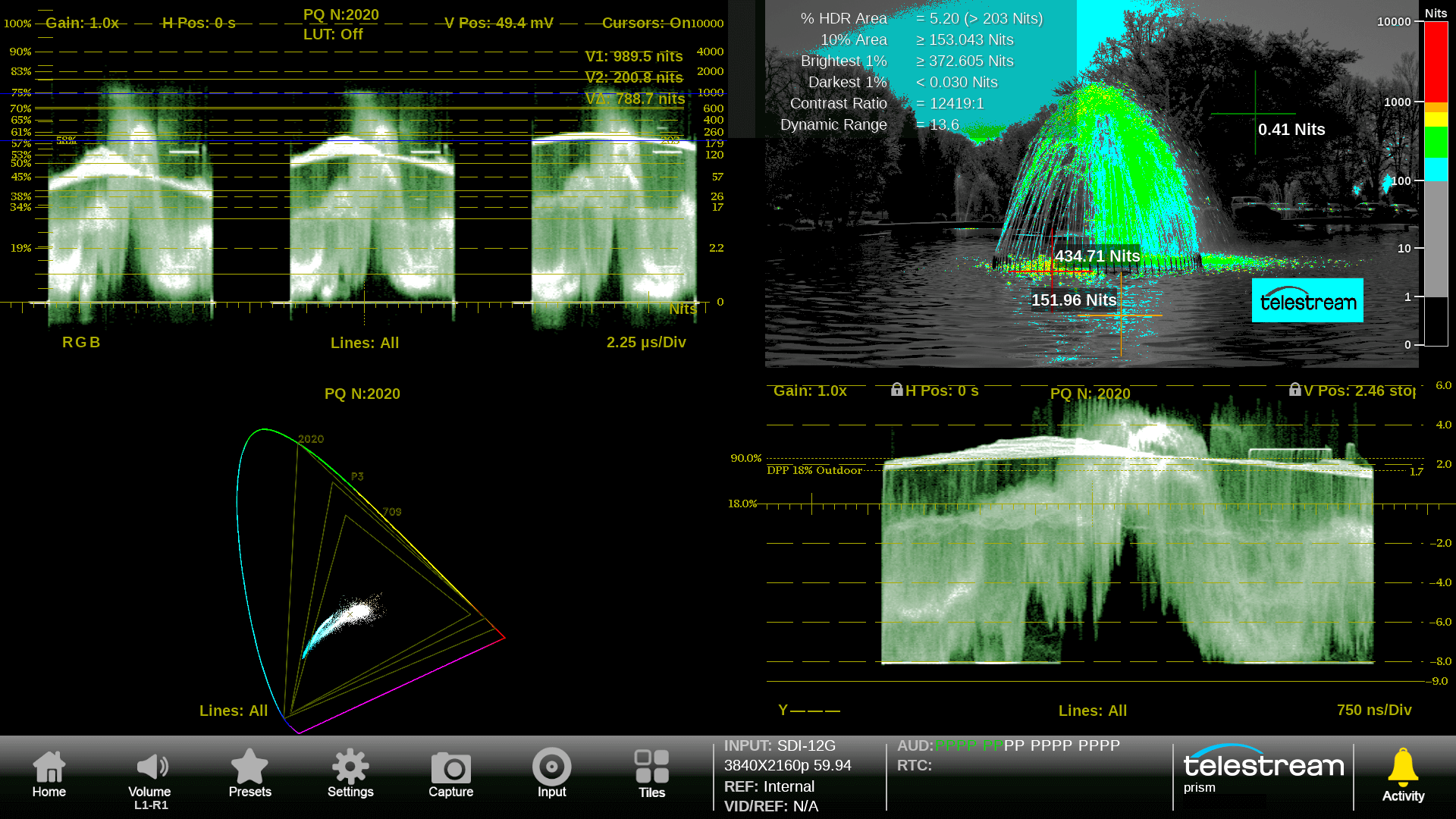 Managing exposure is key to the creation of great content. PRISM provides a mix of traditional and new tools such as False Color Displays, STOP waveform, Lightmeter and internal LUTs for managing S-Log 2, S-Log 3, Log-C, HLG and PQ gamma curves to enable objective level and luminance area measurements to ensure consistency.