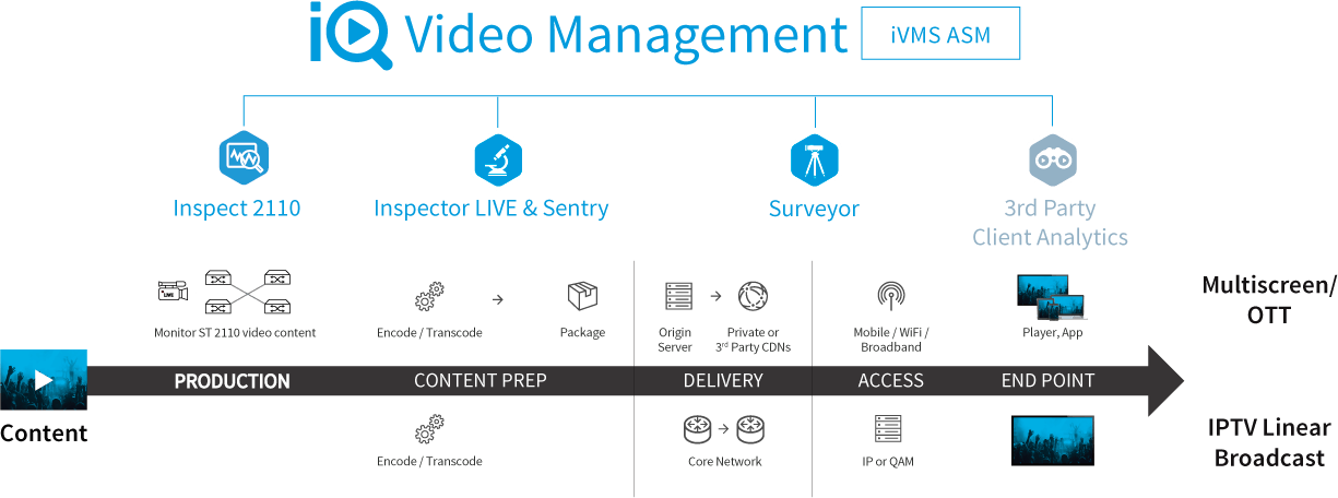 iQ Video Management System (IVMS ASM) enables dramatic operational efficiency by gathering monitoring data from points across the network, and translating that information into visibility, insight and actionable intelligence. IVMS ASM correlates program information, aggregates alerts, and enables faster diagnostics.